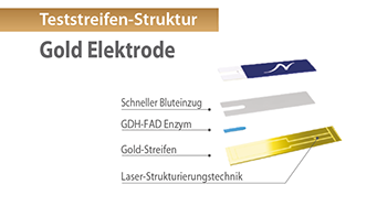 Das Blutzucker-Messgerät GlucoNavii® Pro ver­wendet Goldkontakte auf jedem Blutzucker-Teststreifen. Die Verwendung von Gold als Elektrodenmaterial ermöglicht durch die bessere Leitfähigkeit eine hohe Präzision der Messung und erlaubt die Verwendung eines geringen Blutvolumens.
